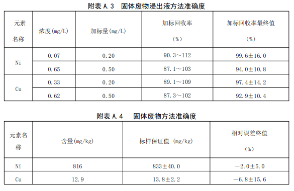 六家實驗室采用電熱板法對含鎳、銅的實際固體廢物浸出液加標樣品進行了測試,加標回收率范圍分別為:87.1%~112%,87.3%~109%。