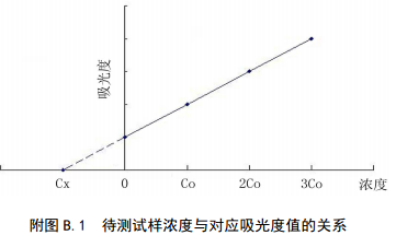 分別量取4等份量待測試樣(濃度為Cx),配制總體積相同的4份溶液。第一份不加標準溶液,第二、三、四份分別按比例加入不同濃度的標準溶液,4份溶液的濃度分別為:Cx、Cx+Co、Cx+2Co、Cx+3Co,加入標準的最小濃度Co≈0.5Cx。用空白溶液調零,在相同條件下依次測定4份溶液的吸光度值。以吸光度值為縱坐標,加入標準溶液的濃度為橫坐標,繪制校準曲線,曲線反向延伸與橫坐標的交點即為待測樣品的濃度。該方法只適用于濃度和吸光值呈線性的區域。待測試樣濃度與對應吸光度值的關系見附圖A.1。
