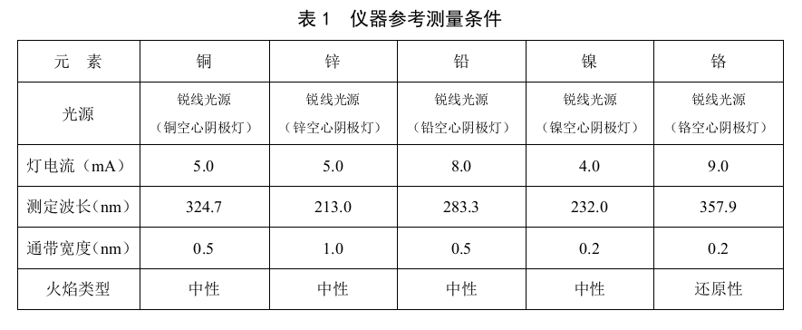 土壤和沉積物經酸消解后,試樣中銅、鋅、鉛、鎳和鉻在空氣-乙炔火焰中原子化,其基態原子分別對銅、鋅、鉛、鎳和鉻的特征譜線產生選擇性吸收,其吸收強度在一定范圍內與銅、鋅、鉛、鎳和鉻的濃度成正比。