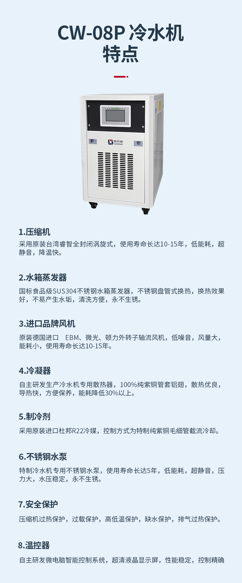 采用原裝臺灣睿智全封閉渦旋式,使用壽命長達(dá)10-15年,低能耗,超靜音,降溫快。