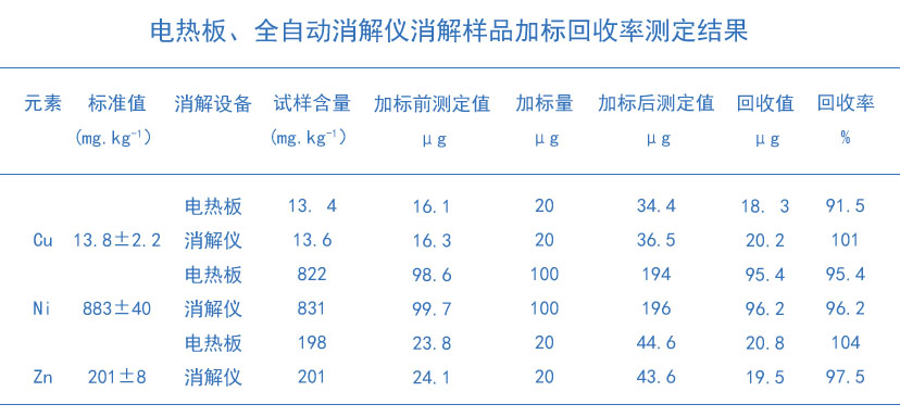 從上表結(jié)果所示:實(shí)驗(yàn)電熱板消解法消解測(cè)定后的元素加標(biāo)回收率在91.5%~104%,全自動(dòng)石墨消解法消解樣品后加標(biāo)回收率在96.2%~101%。兩種消解方法的加標(biāo)回收率均在80%~120%之間表明兩種實(shí)驗(yàn)消解方法都具有較好的加標(biāo)回收率。且全自動(dòng)石墨消解法的加標(biāo)回收率優(yōu)于電熱板消解法。
