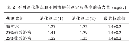 以菠菜標(biāo)準(zhǔn)物質(zhì)(GBW 10015)為研究對象,加入6mL混合酸與電熱板消解。消化終點(diǎn)按以下2種方案進(jìn)行:(1)消化至冒濃白煙,消化液0.5mL左右;(2)消化至近干,沒有流動的消化液。取下稍冷,將以上2種不同消化方案得到的消化液分為3個試驗(yàn)組。各試驗(yàn)組分別加入1mL超純水、1mL 25%硝酸溶液、1mL 25%鹽酸溶液進(jìn)行熱溶解,超純水定容至25mL,于原子吸收分光光度計(jì)上測定各樣品中鉻含量,并確定消化終點(diǎn)及助溶劑,進(jìn)而確定預(yù)處理方法。