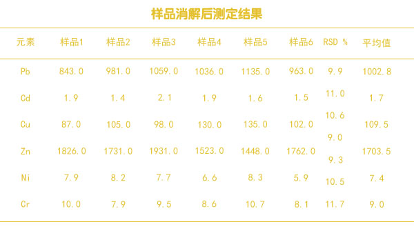 精密度實驗用來考察方法檢測樣品的重現性和準確性,將12組平行樣品分成兩組進行測定得出數據,結果見表(平行樣品消解測定結果表)。經過實驗室電熱板消解的樣品其六種金屬元素鉛、鎘、銅、鋅、鎳、鉻的相對標準偏差在9.9%-17.3%之間。