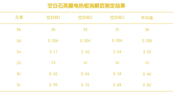 利用實驗室電熱板消解方法對空白膜片和實際樣品進行數值比較得出,將空白膜片分成每組3張,進行實驗室電熱板消解,經過測定得出,空白膜片中六種金屬元素含量的平均值差異相對較小,結果見表(空白石英膜電熱板消解后測定結果)。