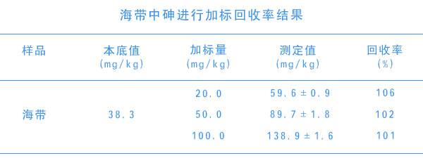 采用加標回收和標準物質(zhì)考察方法的準確性。對海帶樣品進行加標回收試驗,分別加入低、中、高濃度的砷標準溶液,樣品經(jīng)前處理后測定,兩種藻類中砷的加標回收率范圍為96%一109%,結(jié)果下列表。