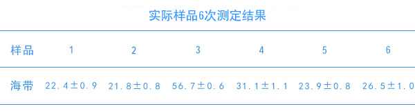 采用本方法對北京市售海帶、(6份)進行測定,測定結(jié)果為3次測定的平均值及標準偏差范圍,結(jié)果見表格。所測定海帶總砷含量范圍為21.8~56.7mg/kg符合實驗效果。