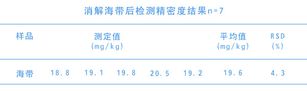 選擇低(19.6mg/kg)、中(38.5mg/kg)、高(66.8mg/kg)3個濃度水平的食用海帶樣品進行精密度試驗,考察方法重現(xiàn)性,3個濃度水平的RSD均<5.0%,結(jié)果見表。