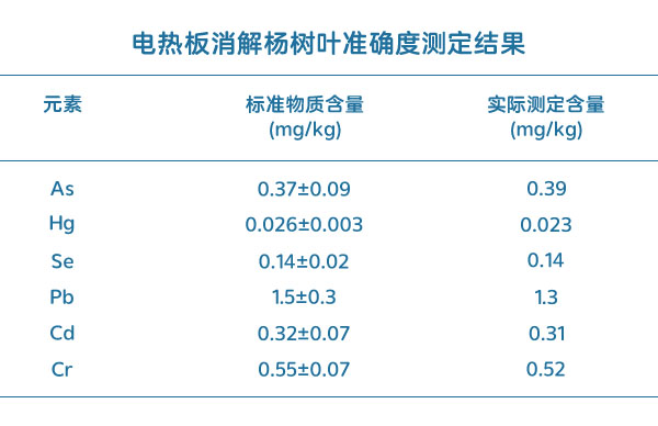采用4的方法步驟對國家標準樣品楊樹葉進行7次重復消解處理,測定方法的精密度和準確度平均結果下如表: