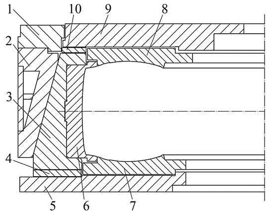 根據工業輪胎模具的結構分為輪胎兩半模具和活絡模具。輪胎兩半模具結構_簡單,主要有上、下側板和上、下鋼圈,上、下側板的分型面在輪胎花紋的中心線上,模具工作時上、下模打開。活絡模具的結構_復雜,主要分為型腔板和模殼兩部分,型腔板為直接與輪胎胎坯接觸的零件,主要有花紋塊,上、下側板,上、下鋼圈;模殼是模具的導向機構,用來控制模具的開合運動,主要有中模套、弓形座、上蓋、底座、耐磨板、導向條、安裝環、提升塊等,模具動作時,弓形座和花紋塊做徑向開合運動。2種模具結構分別如圖1、圖2所示。